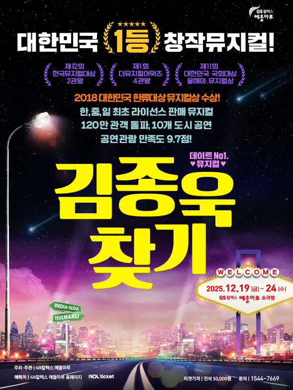 | 일시 | 2025년 12월 19일(금) ~ 12월 24일(수) 12월 19일(금) 15:30, 19:00 12월 20일(토) 14:00, 17:00 12월 21일(일) 14:00, 17:00 12월 23일(화) 10:30, 15:00 12월 24일(수) 10:30, 19:30 * 12월 19일(금) 15:30, 19:00 공연은 전관 예매로 매진되었습니다. * 12월 22일(월)은 예울마루 휴관일로 공연을 진행하지 않습니다. |
