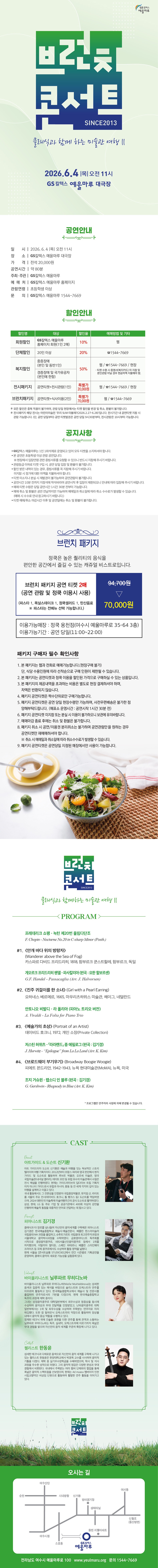 * 브런치 콘서트 당일 공연 프로그램과 연주자는 연주자의 사정에 의해 변경될 수 있습니다.