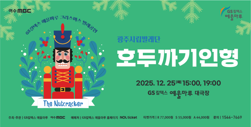 | 일시 | 2025년 12월 19일(금) ~ 12월 24일(수) 12월 19일(금) 15:30, 19:00 12월 20일(토) 14:00, 17:00 12월 21일(일) 14:00, 17:00 12월 23일(화) 10:30, 15:00 12월 24일(수) 10:30, 19:30 * 12월 19일(금) 15:30, 19:00 공연은 전관 예매로 매진되었습니다. * 12월 22일(월)은 예울마루 휴관일로 공연을 진행하지 않습니다. |